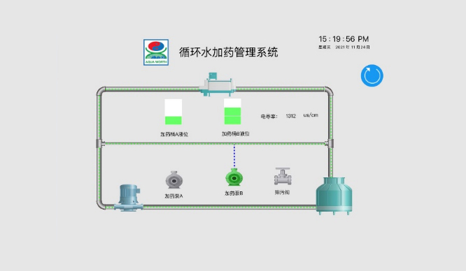 利用電導率、pH等傳感器在線對循環水水質進行實時分析,通過自控系統及智慧云管理平臺實現對循環水的實時檢測,遠程監測,自動排污,自動加藥,濃度控制等、從而實現循環水高效管理。